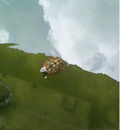 神苑では、金色の甲羅をした珍しい亀が池を泳いでいた。